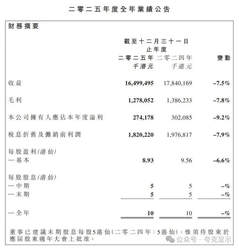 3月26日,信利国际(00732.HK)发布2025年度业绩。于2025年录得之收益约165亿港元相对2024年在收益方面减少约7.5%,主要为智能手机业务收益减少。公司拥有人应占本年度溢利约2.74亿港元,较2024年减少约9.2%。每股盈利8.93港仙,末期股息每股5港仙。