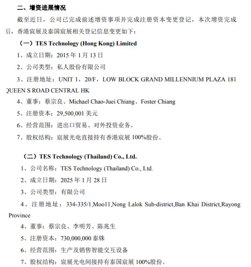 公告显示,宸展光电于2025年5月首次审议通过增资计划,初始拟向香港子公司增资1200万美元,再通过香港子公司向泰国子公司增资3.68亿泰铢。同年7月,公司决定扩大增资规模,将香港子公司增资额度提升至不超过2400万美元(约合1.64亿元人民币),相应地,泰国子公司增资额度增加至不超过7.40亿泰铢(约合1.57亿元人民币)。