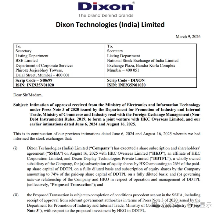 3月9日,印度电子产品制造商Dixon Technologies宣布,与HKC Overseas成立拟议合资企业已获得了印度电子和信息技术部 (MeitY) 的批准。