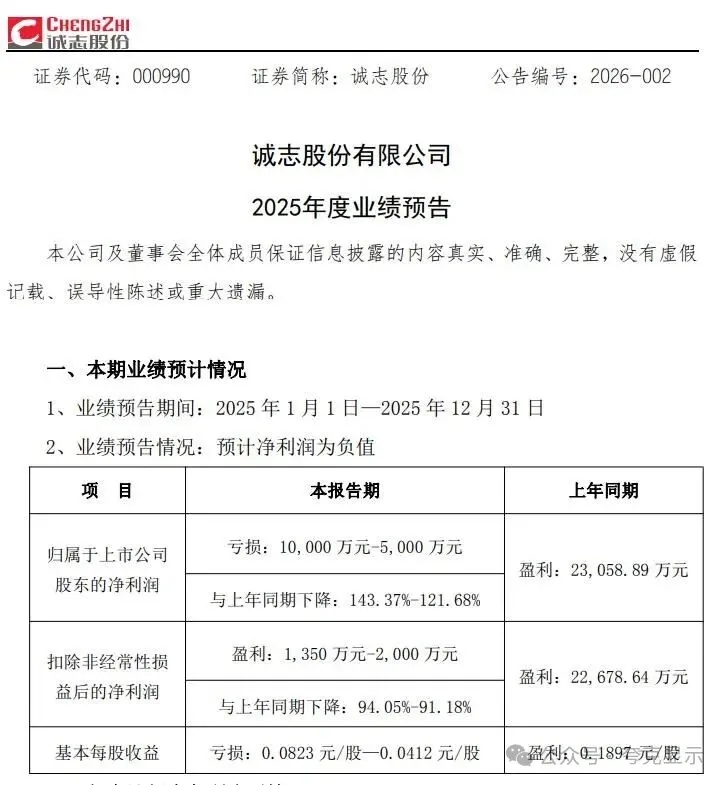 1月30日晚间,诚志股份(000990)披露2025年度业绩预告,预计2025年归母净利润亏损5000万元至1亿元,上年同期盈利2.31亿元;扣非净利润预计1350万元-2000万元,同比下降91.18%-94.05%;基本每股收益-0.0412元/股至-0.0823元/股。以最新收盘价计算,市净率(LF)约0.62倍,市销率(TTM)约0.96倍。