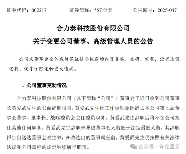 6月13日消息,合力泰高层大变动,董事长、副总经理、财务总监三大高管集体辞职。