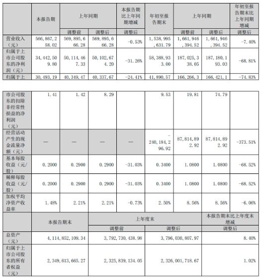 10月25日,三利谱(002876.SZ)公布2023年第三季度报告,报告期营业收入5.67亿元,同比下降0.53%;归属于上市公司股东的净利润3444.25万元,同比下降31.26%;归属于上市公司股东的扣除非经常性损益的净利润3049.32万元,同比下降24.41%。