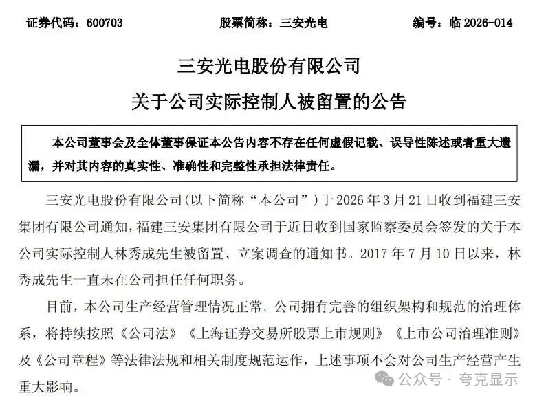 3月22日,三安光电公告称,公司于2026年3月21日收到控股股东福建三安集团有限公司通知,公司实际控制人林秀成被国家监察委员会留置并立案调查。林秀成自2017年7月10日起未在公司担任任何职务。公司表示目前生产经营管理正常,治理结构完善,上述事项不会对公司生产经营产生重大影响。公司将持续关注事项进展并履行信息披露义务。