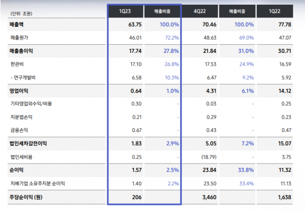 利润方面,17.74 万亿韩元的毛利润,同比环比也双双下滑,上一季度为 21.84 万亿,去年同期则是 30.71 万亿;0.64 万亿韩元的营业利润,同比环比下滑的幅度更大,远不及去年同期的 14.12 万亿,也不及上一季度的 4.31 万亿;1.57 万亿韩元的净利润,不到去年同期的两成,与上一季度的 23.84 万亿差距更大。