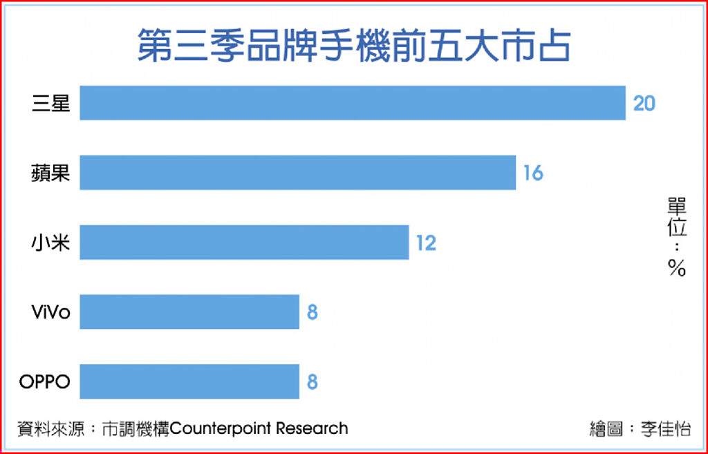 根据Canalys统计,2023年第三季全球智能手机降幅收敛,仅1%,第二季库存已获改善,全球出货量达2.95亿支,其中三星仍稳居霸主,以出货量5,860万台,拿下20%市占率;此外于折迭机三星也稳坐龙头,并会加快折迭机的改朝换代速度,稳固市场地位。