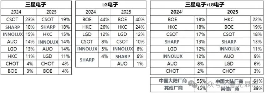 三星电子2025年的LCD TV面板采购来源比例预计为:CSOT :19%,夏普:18%,HKC :15%,Innolux;14%,AUO;14%,LG Display;11%,CHOT;4%,BOE;4%。