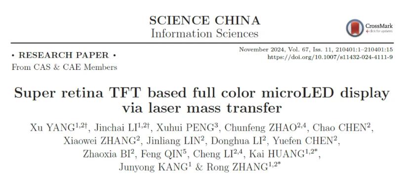 近日,厦门大学、厦门市未来显示技术研究院和天马微电子组成的联合研发团队在SCIENCE CHINA Information Sciences杂志发表了题为“Super retina TFT based full color microLED display via laser mass transfer”的研究论文。论文深入探讨了面向超高像素密度TFT基Micro-LED全彩显示应用的激光巨量转移集成关键技术问题,并对激光剥离、激光转移修复、面板键合等制程所面临的工艺、装备及材料的挑战进行了系统分析。团队创新性提出了提升转移效率与良率的新方法和新技术,在业内首次成功制造出像素密度高达403PPI的超视网膜显示TFT基Micro-LED全彩屏,标志着Micro-LED显示技术的一项重大突破。