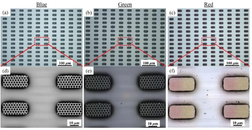 图2 Micro-LED FCoC芯片的光学显微镜下图像:(a)蓝光,(b)绿光和(c)红光;放大后的Micro-LED芯片共聚焦激光扫描显微镜图像:(d)蓝光,(e)绿光和(f)红光