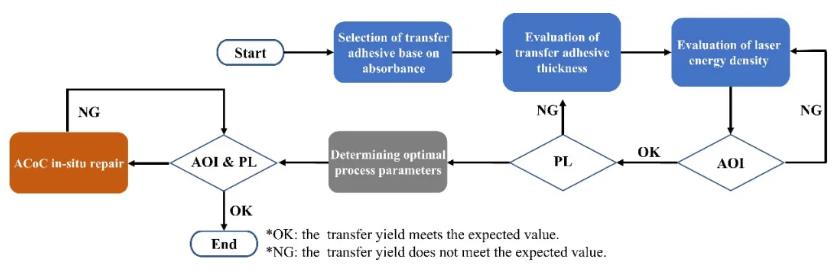 针对超高像素密度Micro-LED全彩显示屏对芯片激光巨量转移定位精度与良率的严苛要求,团队提出一种激光巨量转移过程的多因子关联决策方案,如图3所示。包括:1)基于激光与转移胶相互作用模式,对转移胶类型选择进行综合评判;2)激光能量范围与转移胶厚度关联调控,确保在无损伤情况下实现芯片的高精度、高良率转移;3)采用自动光学检测(AOI)/PL检测定位,对不良芯片进行原位修复。