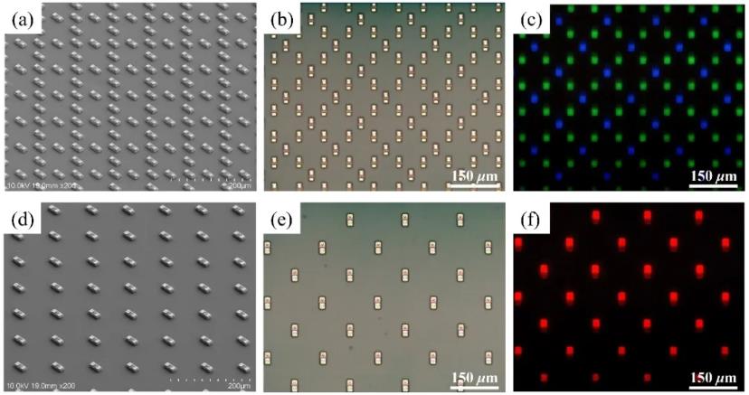 图4(a)GB-ACoC部分芯片排列的SEM图像(侧视图);(b)GB-ACoC芯片的光学显微镜图像;(c)与(b)图同视场下芯片PL显微镜图像;(d)R-ACoC部分芯片排列的SEM图像(侧视图);(e)R-ACoC芯片的光学显微镜图像;(f)与(e)图同视场下芯片PL显微镜图像