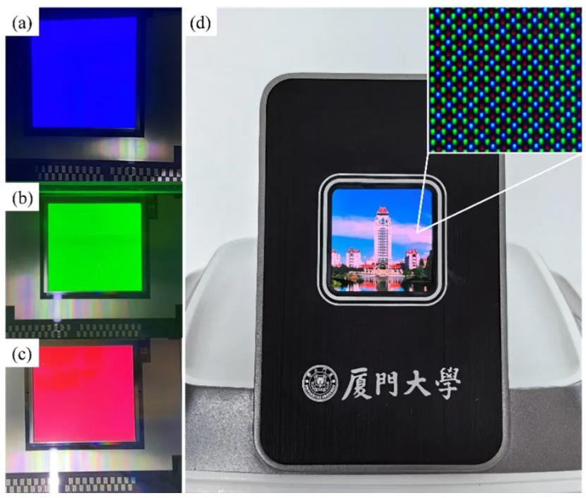 图5 在完成激光巨量转移集成后,像素密度为403 PPI的Micro-LED显示屏分别以(a)蓝色,(b)绿色和(c)红色画面点亮的照片;(d)完成模组封装后的显示屏,实现了全彩显示效果;插图显示了该显示屏中子像素排列情况