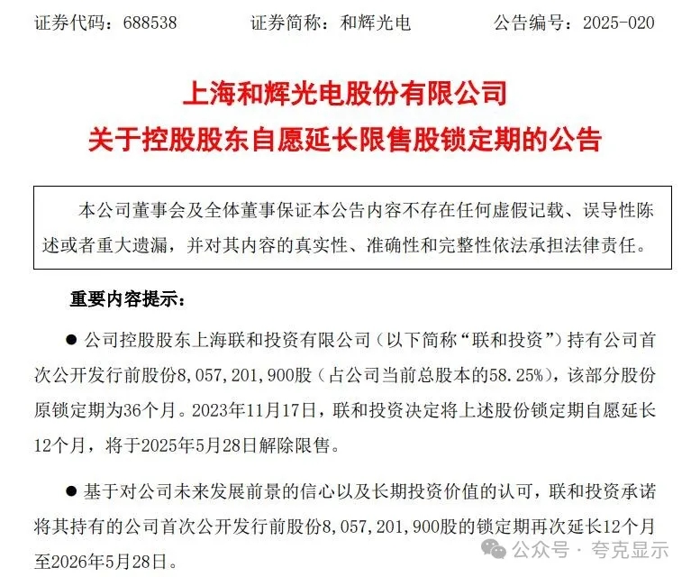为重振投资者信心,不让控股股东撤资引发和辉光电股价雪崩,和辉光电发布了控股股东自愿延长限售股锁定期的公告。