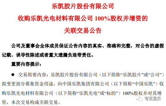 7月19日,乐凯胶片公告称,公司拟变更部分募集资金用途,向中国乐凯集团有限公司(以下简称“中国乐凯”)收购乐凯光电材料有限公司(以下简称“乐凯光电”)100%股权并对其增资。变更后的新项目中,拟2.83亿元收购乐凯光电100%股权,2.5亿元用于TAC膜3#生产线项目。最终收购价格以乐凯光电经具有证券期货资格的评估机构出具的、并经有权国有资产监管部门备案的评估报告的评估值为准。