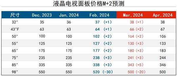 报告指出,2月,液晶电视面板价格全面告涨。小尺寸32、43寸上涨1美元。50寸到65寸上涨2美元,75、85寸上涨3美元。