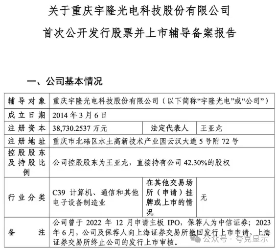 回顾其上市历程,2022年12月宇隆光电沪主板IPO获受理,公司原计划募资15亿元,用于OLED控制板及液晶模组控制板和精密模切生产基地项目,重庆宇隆光电生产基地二期扩产项目,研发中心升级建设项目和补充流动资金。2023年6月,宇隆光电及保荐人向上交所撤回发行上市申请,上交所终止公司的发行上市审核。