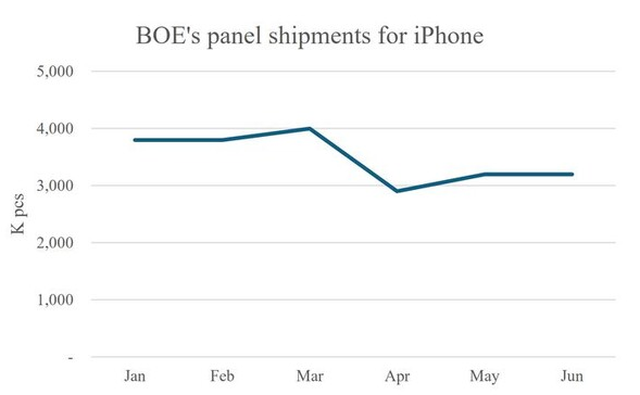 京东方每月的iphone OLED面板出货量(数据来源: ubi research)