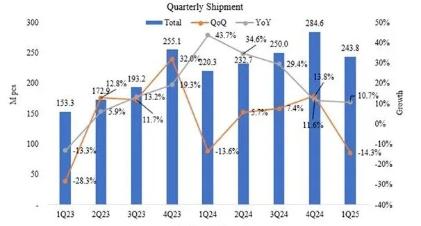 根据市场调研机构UBI Research今日发布的报告,今年第一季度小尺寸OLED的出货量为2.43亿台,较上一季度的2.84亿台减少了4100万台,下降幅度为14.3%。与去年同期相比,出货量增长了10.7%。