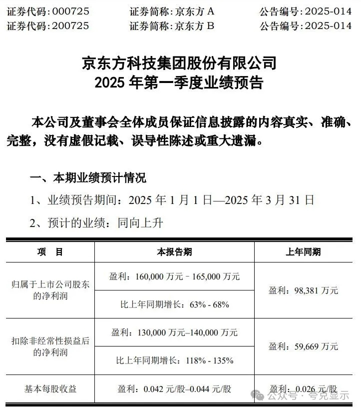 4月15日,京东方A(000725)发布公告,预计2025年第一季度归母净利润将在16亿元至16.5亿元之间,同比增长63%至68%,上年同期盈利9.84亿元。扣非归母净利润预计为13亿元至14亿元,同比增长118%至135%,基本每股收益预计为0.042元/股至0.044元/股。