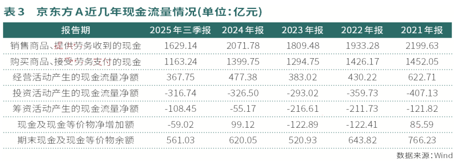 需要指出的是,在2021年-2025年前三季度,京东方A投资活动产生的现金流量净额和筹资活动产生的现金流量净额均为大规模流出,但公司期末现金及现金等价物余额稳定在560亿元—767亿元区间。2025年前三季度,京东方A期末现金及现金等价物余额为561.03亿元,超过了2023年全年水平。