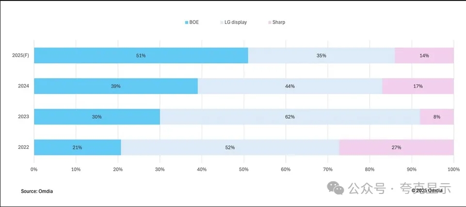 报告显示,BOE预计在2025年将向苹果供应约1150万块笔记本显示屏,市场份额将达到51%,比上一年增长12个百分点。特别是,苹果MacBook Air的主力型号13.6英寸和15.3英寸显示屏,BOE的供应正在逐步增加。
