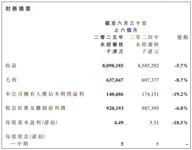 8月27日,信利国际(00732.HK)公布中期业绩,2025年上半年,收益约为80.98亿港元,同比减少约5.7%;毛利为6.37亿港元,同比减少8.7%;公司拥有人应占期间溢利为1.41亿港元,同比减少19.2%,基本每股盈利4.49港仙,拟派中期息每股5港仙。
