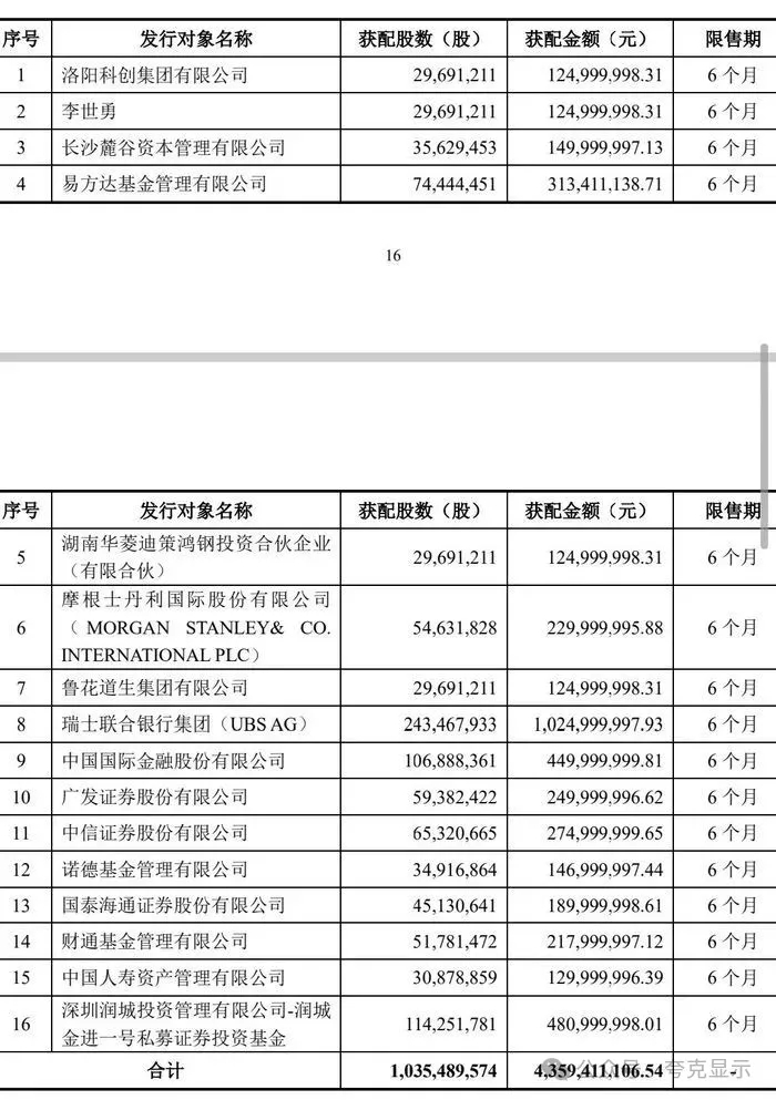 具体来看,瑞银获配10.25亿元,润城投资获配4.81亿元,中金公司获配4.50亿元。公募方面,易方达基金获配3.14亿元,诺德基金、财通基金分别获配2.18亿元、1.47亿元。