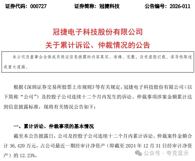 3月10日,冠捷科技(000727)发布公告,截至本公告披露日,公司及控股子公司连续12个月内累计诉讼、仲裁案件金额合计3.64亿元,占公司最近一期经审计净资产的12.23%。