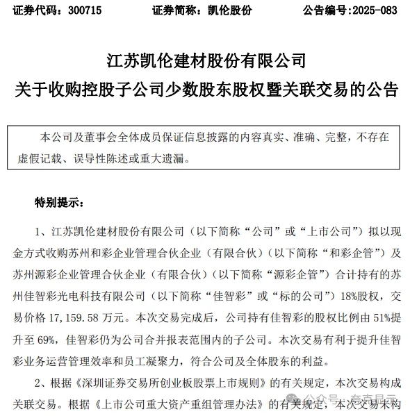 11月18日,凯伦股份(300715.SZ)公告称,公司拟以现金方式收购苏州和彩企业管理合伙企业(有限合伙)及苏州源彩企业管理合伙企业(有限合伙)合计持有的苏州佳智彩光电科技有限公司(以下简称“佳智彩”)18%股权,交易价格1.72亿元。公司持有佳智彩的股权比例由51%提升至69%。本次交易构成关联交易,不构成重大资产重组。