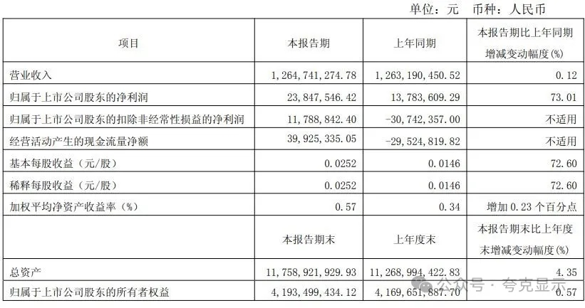 凯盛科技(600552)4月30日披露2025年第一季度报告。公司实现营业总收入12.65亿元,同比增长0.12%;归母净利润2384.75万元,同比增长73.01%;扣非净利润1178.88万元,同比扭亏;经营活动产生的现金流量净额为3992.53万元,上年同期为-2952.48万元;报告期内,凯盛科技基本每股收益为0.0252元,加权平均净资产收益率为0.57%。