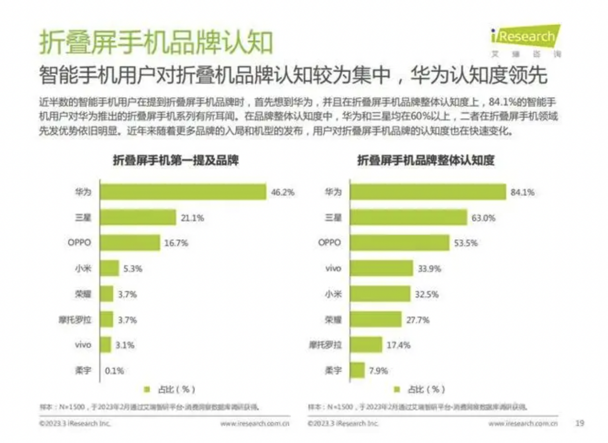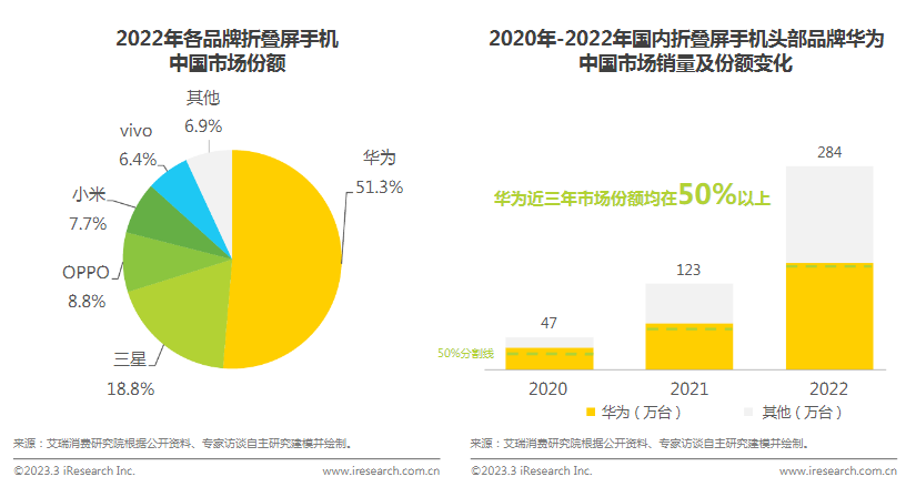 艾瑞咨询发布的《2023 年中国折叠屏手机市场洞察报告》中显示,在 2022 年各品牌折叠屏手机中国市场份额中,华为拿下了惊人的 51.3% 的份额,甚至是第二名的 2 倍之多!更重要的是,华为已经连续 3 年占据国内折叠屏市场 50% 以上份额!