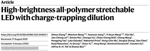 下一代皮肤发光显示器应该是柔软、有弹性和明亮的。在美国斯坦福大学化学工程系主任、K. K. Lee特聘教授鲍哲南看来,尽管这类研究在当下已非常“时髦”,但真正具有可重复拉伸性和低刚度的可伸缩显示器仍然缺乏。