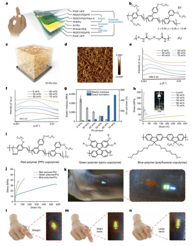 鲍哲南团队的这项研究始于三年多之前。其团队的博士后、该研究的第一作者张智涛发现了一种被称为“SuperYellow(SY)”的黄色发光聚合物,当引入一种有弹性的塑料,即聚氨酯(PU)与其混合时,不仅变得柔软柔韧,还能发出更亮的光。