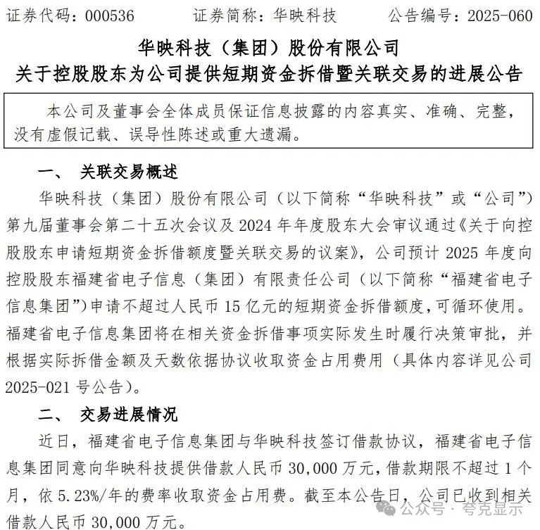 近日,福建省电子信息集团与华映科技签订借款协议,福建省电子信息集团同意向华映科技提供借款人民币30,000万元,借款期限不超过1个月,依5.23%/年的费率收取资金占用费。截至本公告日,公司已收到相关借款人民币30,000万元。截至本公告日,华映科技向福建省电子信息集团借款余额为人民币30,000 万元。