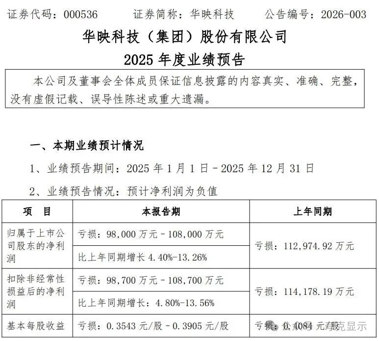 华映科技(000536.SZ)发布2025年度业绩预告,报告期内,归属于上市公司股东的净利润为亏损9.80亿元~10.8亿元,上年同期亏损11.30亿元;扣除非经常性损益后的净利润为亏损9.87亿元~10.87亿元,上年同期亏损11.42亿元。