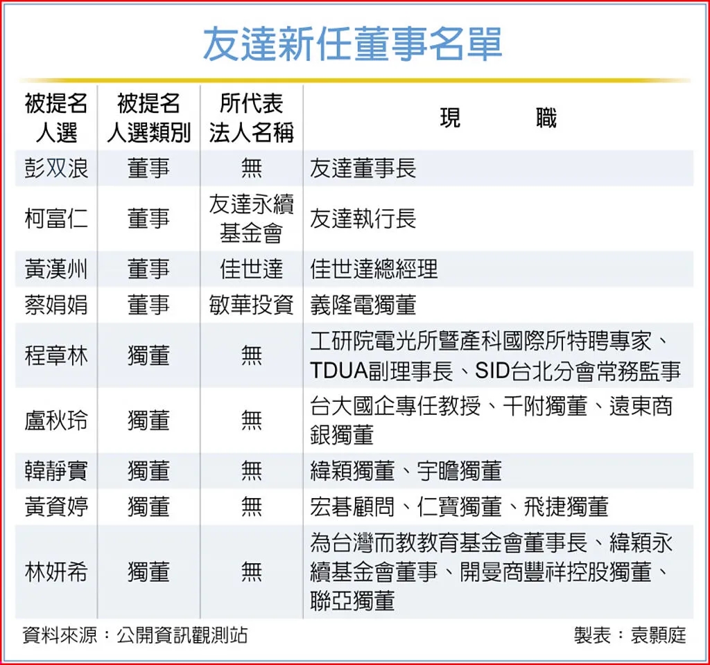 3月12日消息,友达今年股东会将改选董事,最新董事候选人提名名单出炉,董事长彭双浪、执行长柯富仁、佳世达总经理黄汉州、前元太总经理蔡娟娟不变。独董当中,苏艳雪先前已辞任,而彭锦彬已达三届,因此增加两位新面孔,包括前宏碁营运长黄资婷、前美商宏智国际顾问台湾总经理林妍希,显见友达冲刺场域新事业的努力。