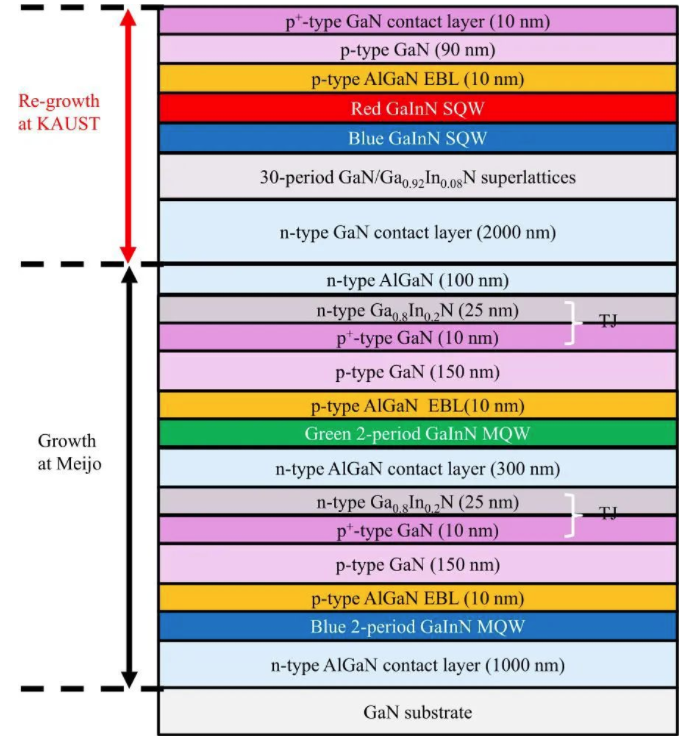 在Micro LED外延制造阶段,研究团队通过金属有机气相外延 (MOVPE) 技术,分两个阶段在 GaN 基板上生长 RGB Micro LED阵列材料。其中,蓝光和绿光层由名城大学团队负责生长,最后的红光阶段由KAUST团队负责生长,RGB层间由隧道结 (Tunnel Junctions,TJ) 分隔。
