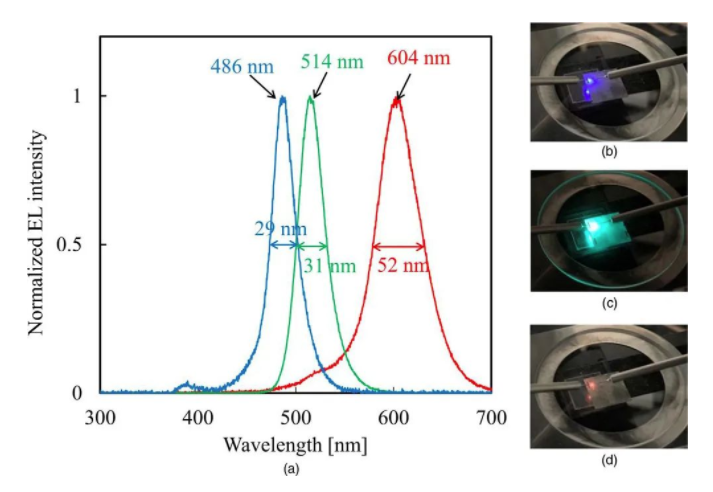 经研究人员测试,从基板侧收集到的数据显示,在电流密度为50A/cm²下的蓝-绿-红 Micro LED 电致发光 (EL) 光谱的峰值波长分别为486nm、514nm 和 604nm(图 3)。相应的半峰全宽 (FWHM) 为 29nm、31nm 和 52nm。研究人员表示,这些数值与单独制造的LED器件数值相似。