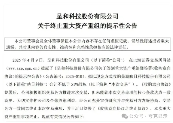 公告显示,呈和科技原拟以现金方式收购芜湖映日科技股份有限公司(以下称“映日科技”或标的公司)合计不低于51%股权。双方《收购意向协议》签署后,公司积极组织交易各方推进本次交易,但未能就本次交易事项的核心条款达成一致意见。特别是关于业绩承诺方的安排在沟通过程中发生了较大变化,降低了公司对本次交易及未来整合的信心。因此,经公司充分审慎研究并与交易对方友好协商,交易各方一致同意终止本次交易事项。交易各方一致同意终止本次交易事项。