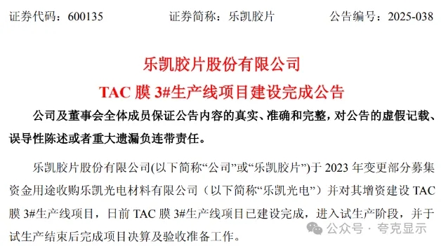 7月30日,乐凯胶片股份有限公司(简称“乐凯胶片”)发布公告称,公司于2023年变更部分募集资金用途收购乐凯光电材料有限公司(以下简称“乐凯光电”)并对其增资建设TAC膜 3#生产线项目,日前TAC膜 3#生产线项目已建设完成,进入试生产阶段,并于试生产结束后完成项目决算及验收准备工作。