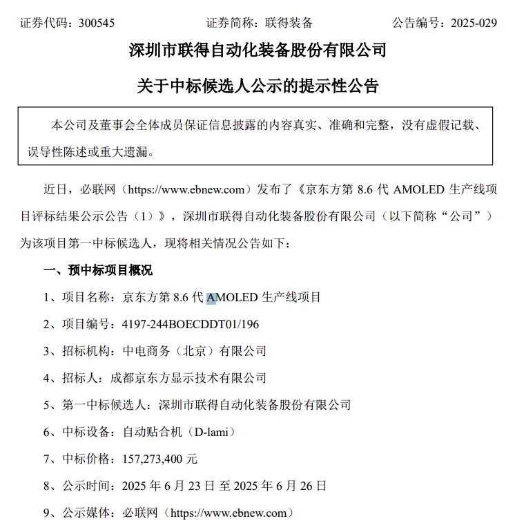 近日,必联网发布了《京东方第 8.6 代 AMOLED 生产线项目评标结果公示公告》,其中深圳市联得自动化装备股份有限公司为该项目第一中标候选人。