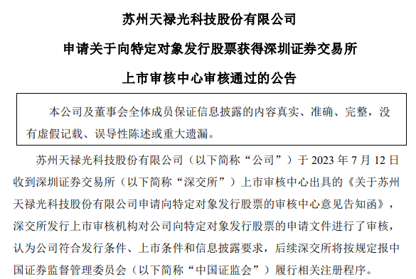 7月13日,天禄科技(301045.SZ)12日晚间披露公告,公司收到深交所上市审核中心出具的《关于苏州天禄光科技股份有限公司申请向特定对象发行股票的审核中心意见告知函》。 天禄科技本次发行对象为梅坦,系公司的控股股东、实际控制人之一。