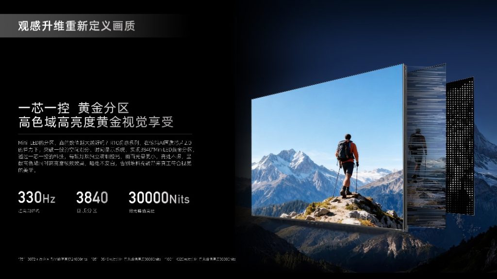 不同于行业单纯比拼分区数量,R10观感系列从人眼视觉规律出发,打造3840个独立背光分区(85英寸),并创新采用“一芯一控”技术,1颗控光芯片对应1颗灯珠,可逐帧调控每颗灯珠的明暗度,让影像细腻度与视觉舒适度达成平衡。同时在惊鸿AI画质芯片2.0的算力加持下,该技术更突破传统空间划分与时间显示限制,实现亮处不曝、暗处不发白的效果,亮部色彩明艳吸睛,暗部细节清晰尽显,告别硬件堆料,最终呈现出真正符合人眼感知的画质美学,让每一处画面细节都能自然、清晰地传递给用户。