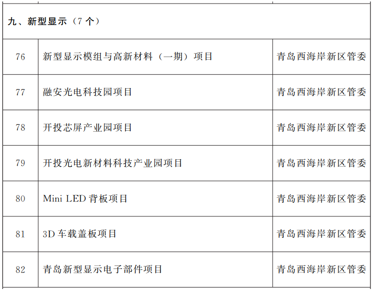 其中,重点建设类项目含新型显示项目7个,分别为新型显示模组与高新材料 (一期)项目、融安光电科技园项目、开投芯屏产业园项目、开投光电新材料科技产业园项目、Mini LED背板项目、3D车载盖板项目、青岛新型显示电子部件项目。重点准备类项目包含京东方后续项目等。