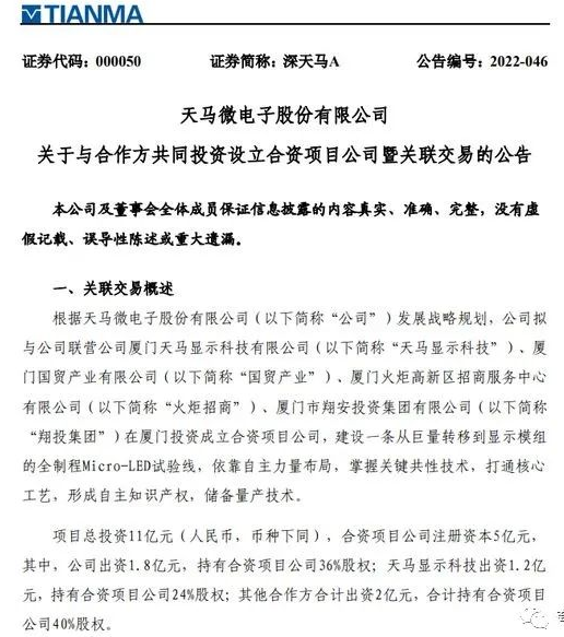 深天马A在公告中称,上述项目立足打造成为全行业领先的Micro-LED技术创新研发平台、产品应用开发平台及全行业开放的科研成果转化平台。同时联合终端客户、科研院所、上下游产业链厂商,借此打通产学研用各环节,加快实现从Micro-LED显示基础、系统集成到应用的全链条工程技术突破,加快Micro-LED技术实现商业化落地。