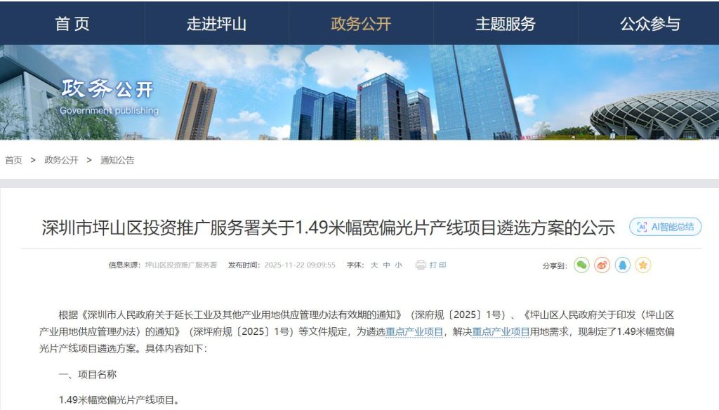 盛波光电拟建设1.49米幅宽偏光片产线项目,总投资13.34亿元,规划年产能约1800万平方米,覆盖LCD和OLED应用领域。