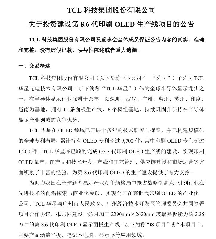 9月12日晚间,TCL科技(000100.SZ,股价4.41元,市值917.2亿元)公告称,公司、公司子公司TCL华星与广州市人民政府、广州经济技术开发区管理委员会共同签署项目合作协议,拟共同建设一条月加工2290mmx2620mm玻璃基板能力约2.25万片的第8.6代印刷OLED显示面板生产线(以下简称“t8项目”),主要产品涵盖平板、笔记本电脑、显示器等应用领域。