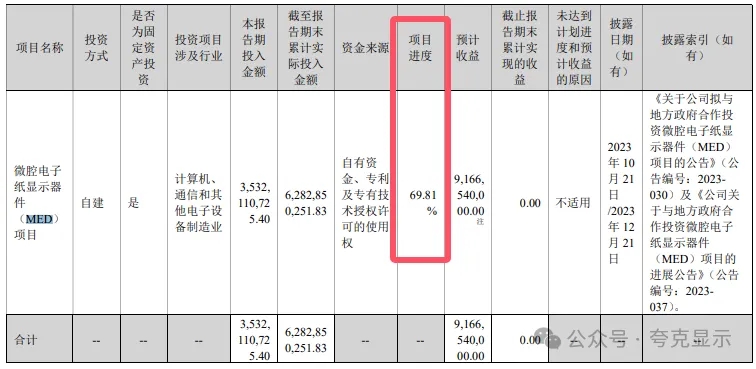 在这份年报中,莱宝高科提到了浙江微腔电子纸显示器件(MED)项目的最新情况。截至报告期末,项目累计实际投入金额62.83亿元,建设进度已完成69.81%。