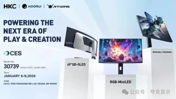 12月28日消息,惠科股份美国拉斯维加斯当地时间本月25日发布CES 2026参展预告新闻稿,宣布旗下惠科 (HKC)、科睿 (KOORUI)、蚂蚁电竞 (KOORUI) 品牌均将在展会上带来显示器新品。