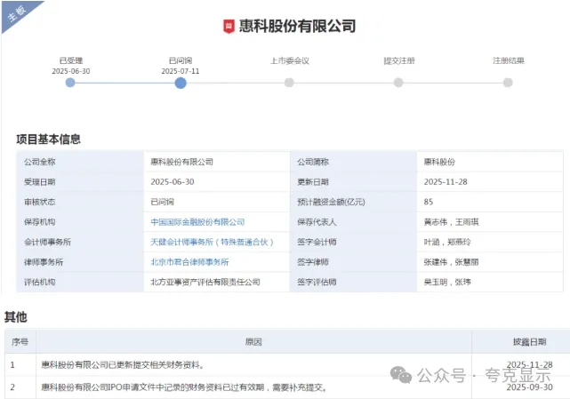 据深交所官网于11月28日披露,惠科股份主板IPO状态处于“问询”阶段。此前,其因财务资料已过有效期需补充提交而中止。