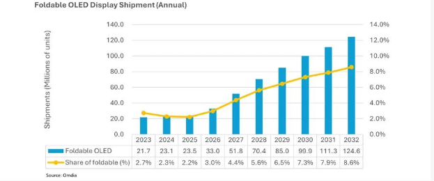 9月11日消息,据Omdia最新研究,折叠OLED(有机发光二极管)显示屏出货量预计到2032年将达到1.246亿片,占OLED显示屏总市场的8.6%。